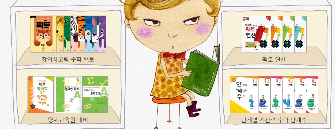 킨더팩토, 키즈팩토, 초등팩토뿐만 아니라 팩토 연산과 계산력 수학, 그리고 영재 교육원 대비 문제집까지 다양하게 있습니다.