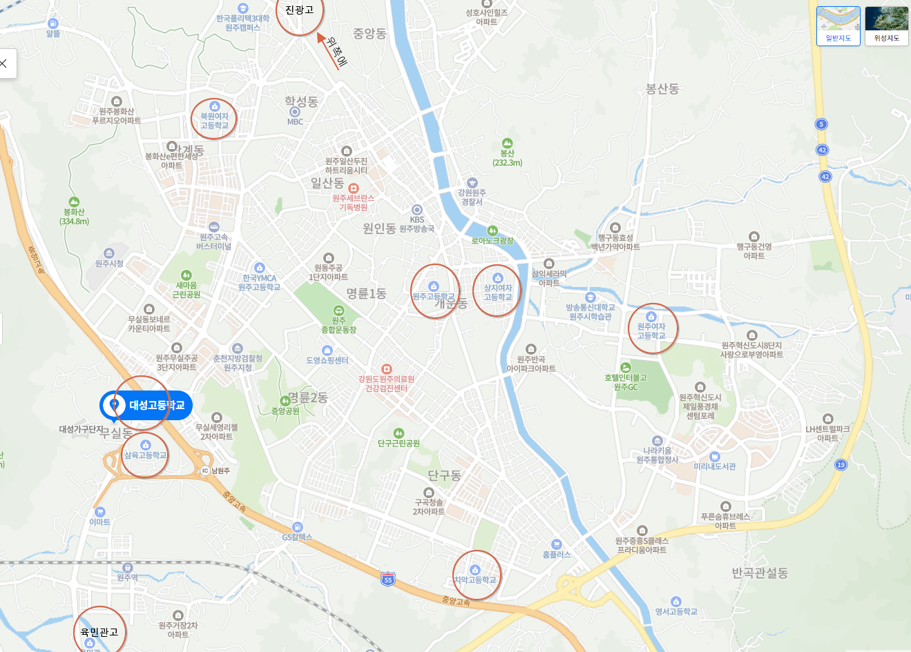 인문계 고등학교 기준으로 원주 지도 위에 위치를 찾아보았습니다.